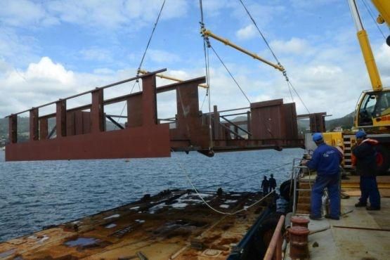 While the cables and grips of the block are being prepared by the factory’s team for the flag-raising, a pontoon cruises all the estuary dragged by one of the ships of Botamavi, Rada primero, from the facilities of Freire shipyard, its owner.  Freire Uno is installed in parallel to the dock of A Xunqueira and starts the slow maneuver. “Whe may go step by step”, assures Brañas. In around half an hour the heavy piece lays on the pontoon, which will use other 30 minutes to cross the estuary and arrive at its destination. “There are not many companies in the estuary that can produce blocks of this size and move them through the sea”, explains Brañas.