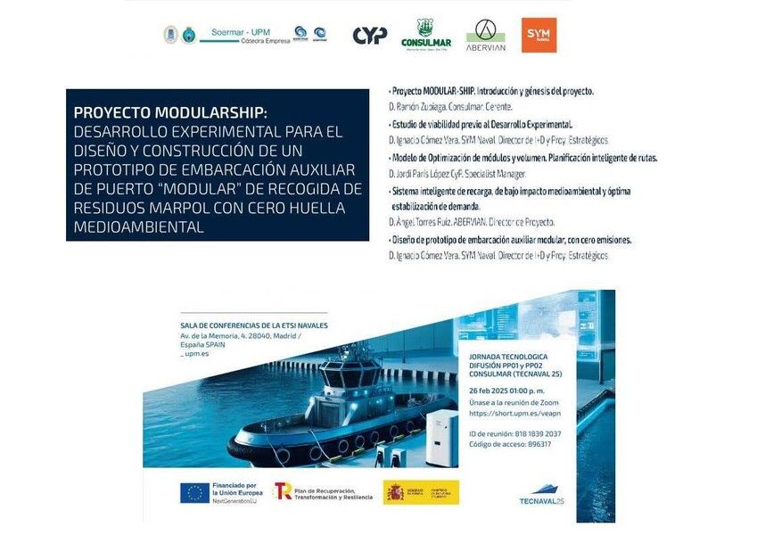 La Cátedra Empresa SOERMAR – UPM ha organizado una jornada tecnológica, presencial y por streaming, sobre los proyectos PP01 EV4MODULAR-SHIP y PP02 MODULARSHIP el próximo 26 de febrero a las 13.00 horas en la Escuela Técnica Superior de Ingenieros Navales (ETSIN) de Madrid para mostrar los avances que se han logrado hasta el momento y su impacto en el sector naval, marítimo y portuario.