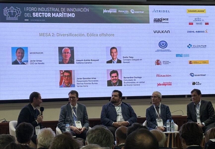 La segunda mesa, ‘Diversificación. Eólica offshore’, contó con Javier González Arias, responsable de Renovables Marinas Flotantes Bureau Veritas Iberia; Joaquín Andrés Bosqued, jefe de Desarrollo de Negocio y Mercado Offshore de Astilleros Canarios; Emilio Tatay, consejero delegado en Navacel, y Bernardino Couñago, cofundador y director general de BlueNewables. El moderador de la mesa fue Javier Arnau, CEO de Navalia, quien opinó que “la transversalidad eólica marina es una oportunidad única para el sector naval” durante la presentación de los ponentes.